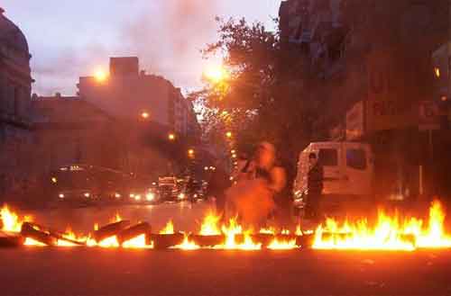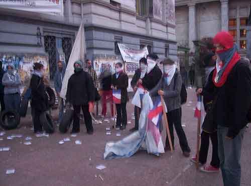 Sobre las 20 horas partió la movilización por la principal avenida, de espaldas a los neumáticos que continuaban encendidos. Encabezaba una pancarta que decía “con el Che Guevara, por la liberación nacional y latinoamericana”, e inmediatamente la columna de Fogoneros, con el despliegue de su autodefensa, el pañuelo en el rostro y el palo en la mano, bandera de Artigas en la punta.